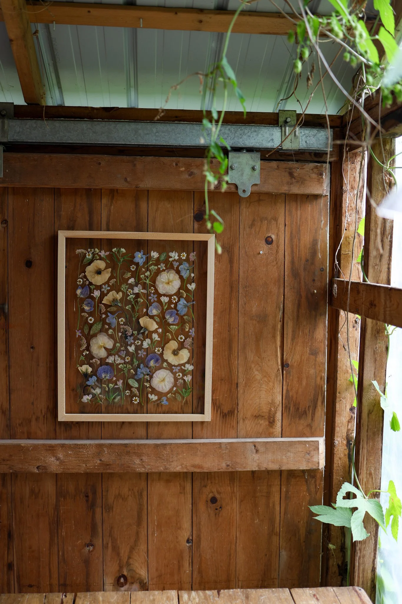 Once the flowers from our exchange are pressed I will create a piece of art with them. This requires a bit of back and forth as we can discuss our background colour and the shape and flow of the piece.